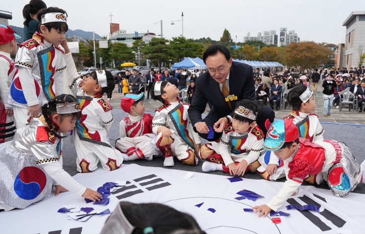 ![]() 윤병태 시장과 아이들이 태극기 만들기 체험을 함께하고 있다 |