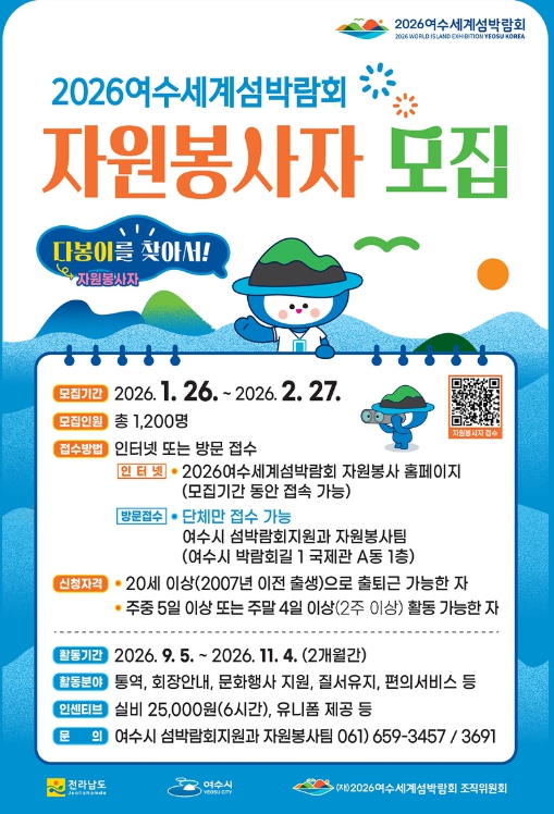 ![]() 여수시는 2026여수세계섬박람회를 함께할 자원봉사자 “다봉이” 1,200여 명을 오는 1월 26일부터 2월 27일까지 한 달간 모집 예정이라고 밝혔다. |