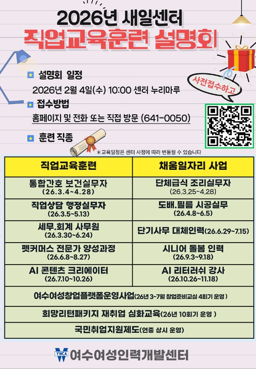 ![]() 여수여성인력개발센터가 오는 2월 4일(수) 오전 10시, 여수여성인력개발센터 4층 누리마루 강당에서 ‘2026년 직업교육훈련 설명회’를 개최한다. |