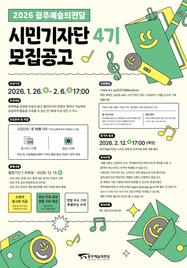 선발된 시민기자단은 오는 3월부터 12월 말까지 약 10개월간 활동하며, 광주예술의전당의 공연과 문화예술 현장을 취재해 기사와 콘텐츠를 제작하게 된다. 전당은 활동 기자단에게 소정의 원고료, 공연 관람 기회, 우수 기자 시상 등 다양한 혜택을 제공할 예정이다.