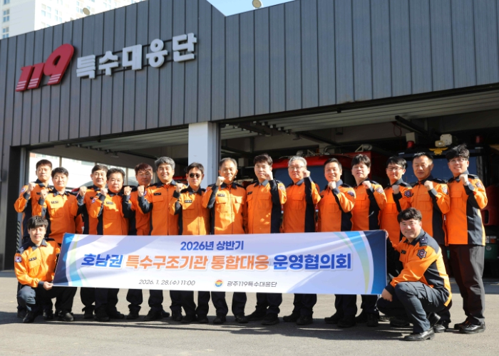 [AI 호남뉴스]광주광역시 119특수대응단은 28일 대응단 작전실에서 ‘2026년 상반기 호남권 특수구조기관 통합대응 운영협의회’를 개최했다.