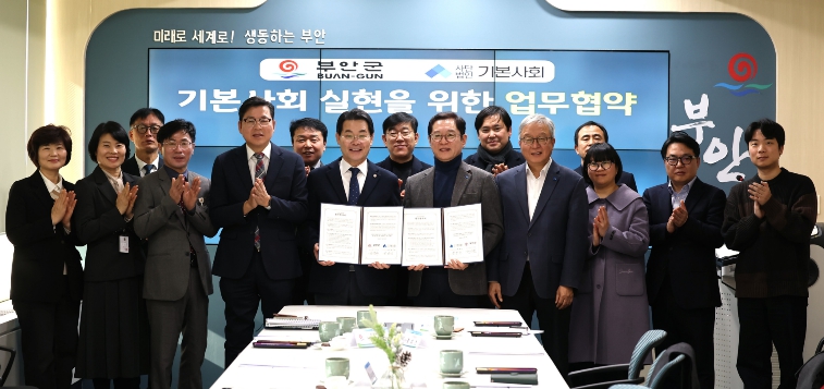 이번 협약은 인구감소와 지역소멸 위기에 대응해 군민의 보편적 삶을 보장하는 ‘부안형 기본사회 모델’을 체계적으로 추진하기 위한 것으로, 양 기관은 정책 연구와 사업 기획, 실행 단계까지 상호 협력하기로 했다.