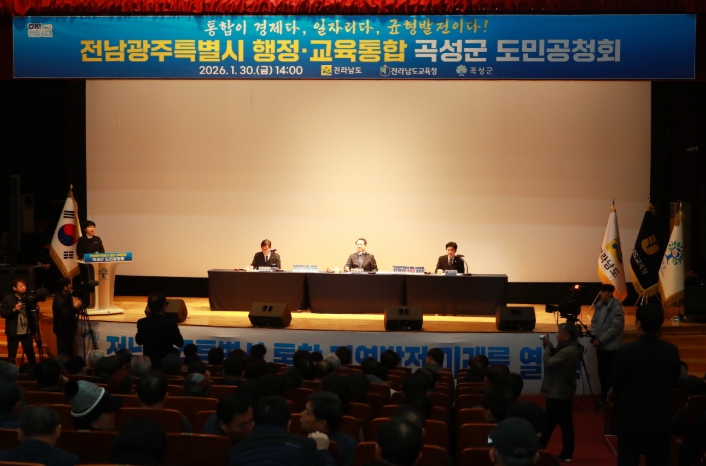 ![]() 지난 1월 30일 곡성군 레저문화센터 동악 아트홀에서 개최된 전남광주특별시 행정·교육통합 도민공청회 |