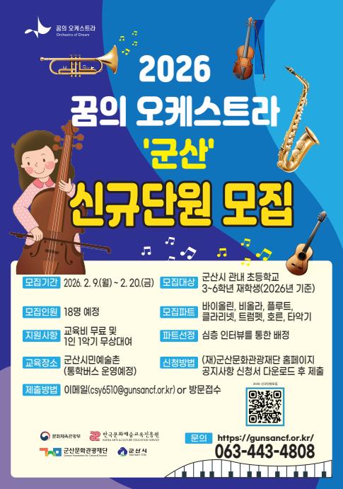 ![]() 군산문화관광재단, ‘2026 꿈의 오케스트라 군산’ 신규단원 모집 |