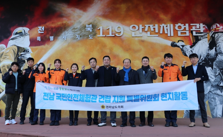 ![]() - 전라남도의회 ‘전남 국민안전체험관 건립 지원 특별위원회’가 전북119안전체험관 운영 및 체험 프로그램에 대한 벤치마킹을실시한 뒤 기념촬영을 하고 있다. |