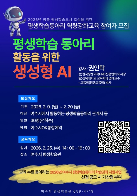특히 이번 교육을 수료한 동아리는 ‘2026년 여수시 평생학습동아리 학습강좌 지원사업’ 공모 신청 시 가산점을 받을 수 있어 동아리 관계자들의 관심이 높을 것으로 기대된다.