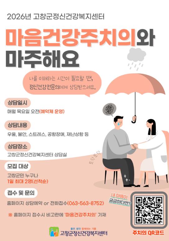 ![]() 고창군정신건강복지센터, 2026년 ‘마음건강주치의’ 사업 운영 |