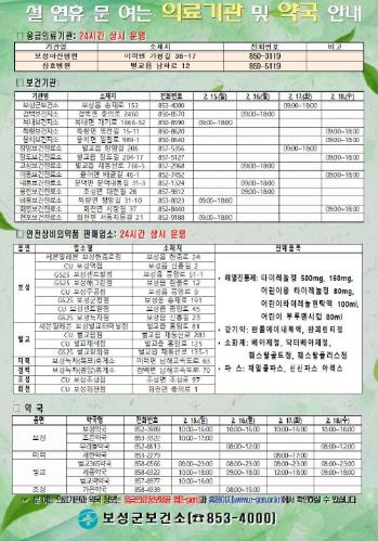 ![]() 보성군, 2026년 설 연휴 종합대책 추진_설 연휴 문 여는 의료기관 및 약국 안내 포스터 |