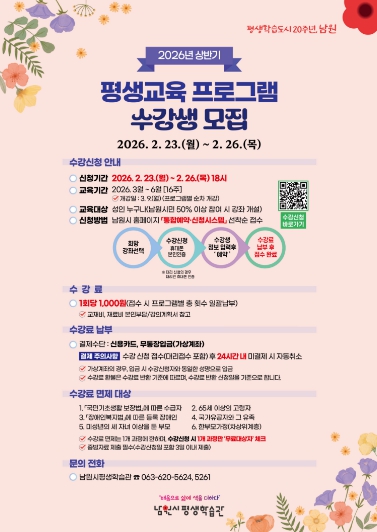 ![]() 남원시평생학습관, 2026년 상반기 프로그램 수강생 모집 |