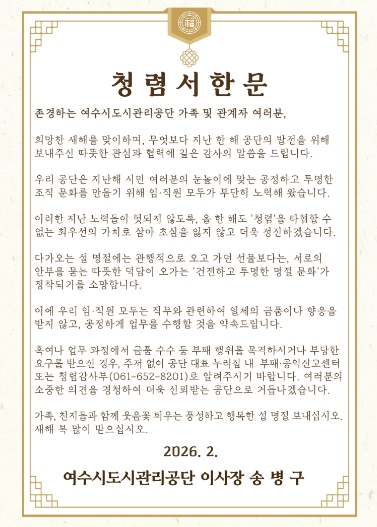 ![]() 여수시도시관리공단, 설 명절 앞두고 ‘청렴서한문’ 발송 |