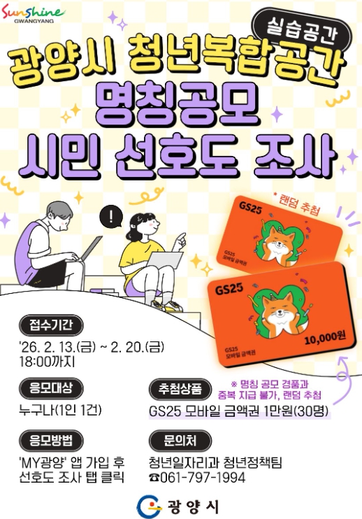 참여를 희망하는 시민은 ‘MY광양’ 앱에 가입한 후 ‘청년복합공간(실습공간) 명칭 시민 선호도 조사’ 메뉴에서 투표하면 된다.