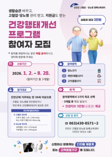 센터 관계자는 “고혈압과 당뇨병은 꾸준한 관리가 무엇보다도 중요하다”며 이번 프로그램이 주민들의 혈압·혈당 조절률 향상과 합병증 예방에 도움이 되길 기대한다며, 자세한 사항은 진안군 고혈압·당뇨병 등록교육센터로 문의하면 된다.