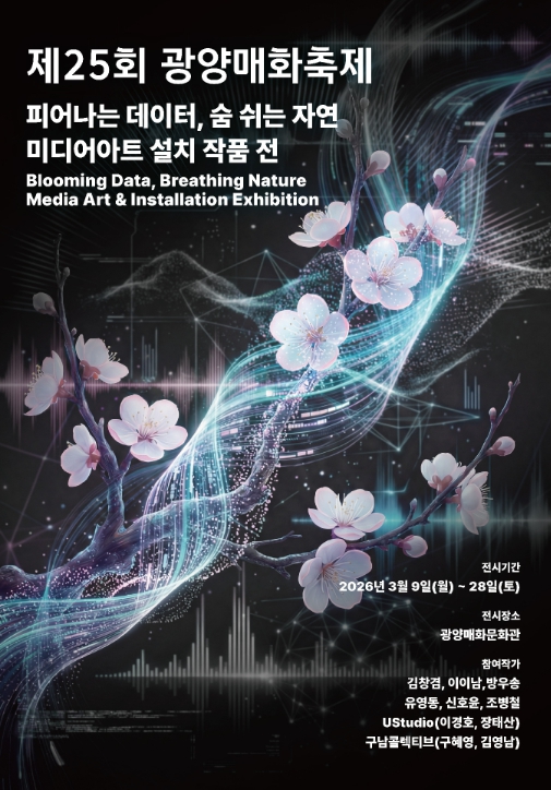 광양시는 제25회 광양매화축제 주제인 ‘매화, 사계절 꺼지지 않는 빛 속에서 피어나다’를 예술로 확장한 기획 전시 '피어나는 데이터, 숨 쉬는 자연(Blooming Data, Breathing Nature)' 를 3월 9일부터 28일까지 광양매화문화관에서 개최한다고 밝혔다.