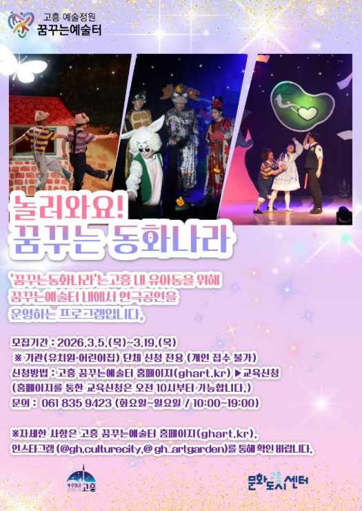 ![]() 고흥군, 어린이 연극 ‘놀러와요 '꿈꾸는 동화나라'’ 단체 관람 모집 |