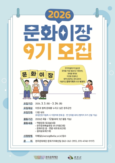 모집 기간은 2026년 3월 3일부터 3월 24일까지이며, 이웃과 함께 문화를 누리고 싶은 완주군민이라면 누구나 신청할 수 있다.'문화이장 9기 모집'과 관련된 기타 자세한 내용은 완주문화재단 홈페이지에서 확인 가능하다.