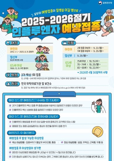 무료 접종 대상은 ▲어린이(2012.1.1.~2025.8.31. 출생자) ▲임신부 ▲65세 이상 어르신(1960.12.31. 이전 출생자)이다. 접종은 주소지와 관계없이 전국 위탁의료기관과 보건소에서 받을 수 있다.