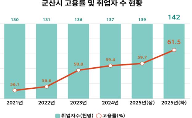 지난달 24일 통계청 ‘지역별 고용조사’에 따르면, 군산시 2025년 하반기 고용률은 작년 하반기 대비 2.1%p 상승했으며, 취업자 수는 작년 하반기와 비교해 5,000명이나 증가하여 14만 2,000명을 기록했다.