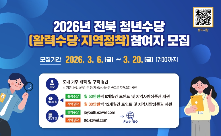 전북형 청년활력수당은 취업을 준비하는 청년에게 구직활동비를 지원해 안정적인 취업 준비 환경을 조성하고, 청년의 자립 기반 마련과 사회 진입을 촉진하기 위해 추진되는 사업이다.