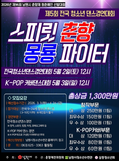 참가 신청은 오는 4월 24일까지며, 참가를 희망하는 팀은 남원시청 또는 남원청소년수련관 홈페이지에서 신청 양식을 내려받아 작성한 후 댄스 영상과 함께 이메일로 제출하면 된다.
