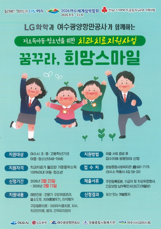 ![]() 여수시가 민·관이 협력해 저소득 아동·청소년의 구강건강 증진을 위한 치과치료 지원사업 「2026 꿈꾸라, 희망스마일」을 추진한다. |
