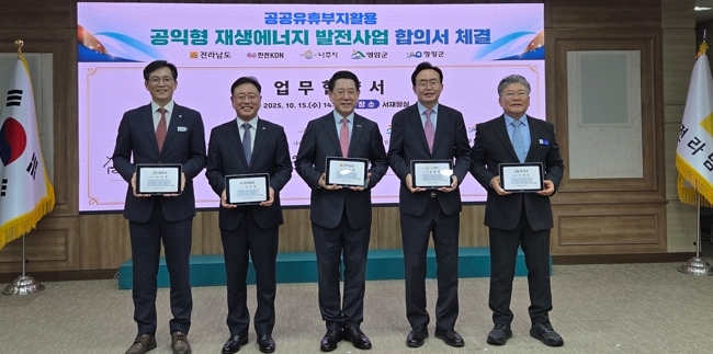 ![]() 나주시가 지난해 10월 전라남도, 영암군, 영광군, 한전KDN(주)과 함께 ‘공익형 재생에너지 발전사업’ 업무협약을 체결했다. |