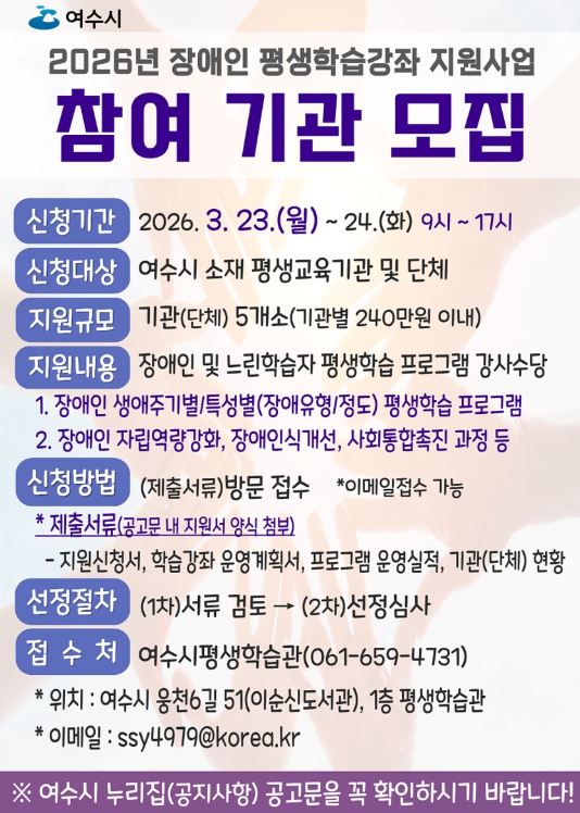 모집 대상은 여수시 소재 평생교육기관 및 단체로, 총 5개 기관·단체를 선정해 1개소당 최대 240만 원의 강사수당을 지원할 계획이다.