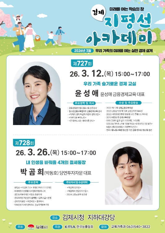 '우리 가족의 미래를 여는 실전 경제 설계'라는 테마 아래, 오는 12일은 윤성애 강사, 26일은 박곰희 강사를 초청하여 김제시청 대강당에서 15시부터 강연을 진행한다.