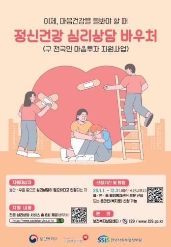![]() 정읍시, 우울·불안 극복 돕는 ‘심리상담 바우처 지원’…최대 8회 제공 |