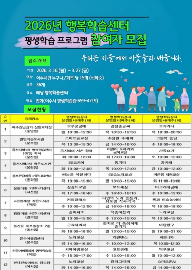 프로그램은 여수진남상가 상인교육장, 광림마을 커뮤니티센터 등 12개 생활권 학습공간에서 진행되며 과목당 15명 내외 선착순으로 모집한다.