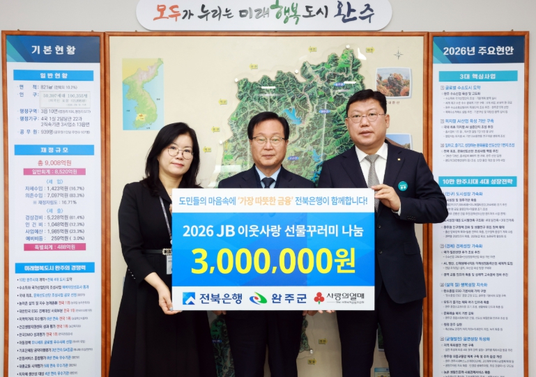 16일 전북은행은 완주군청 군수실에서 조인성 부행장과 김성두 완주군청지점장 등이 참석한 가운데 유희태 완주군수에게 ‘2026 JB이웃사랑 선물꾸러미’를 전달했다.
