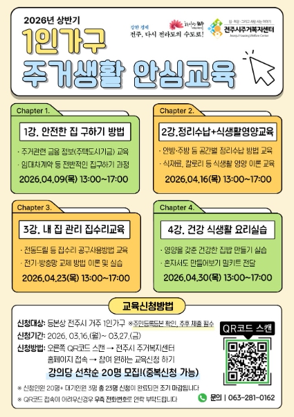 ![]() 전주시 주거복지센터, ‘1인 가구 주거생활 안심교육’ 참여자 모집 |