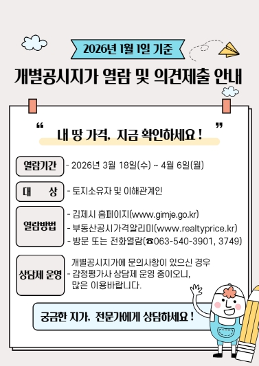 ![]() 김제시, 30만 필지 개별공시지가 열람 및 의견 청취 |