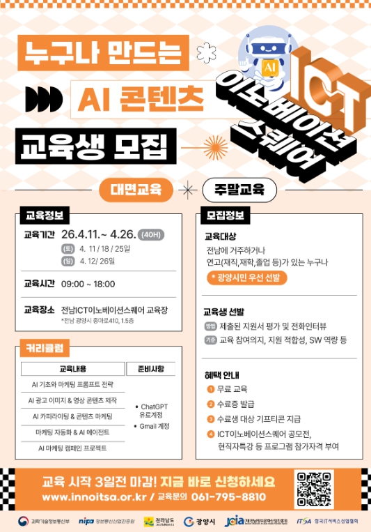 교육 신청은 전남ICT이노베이션스퀘어 누리집에서 가능하며, 자세한 사항은 운영사무국으로 문의하면 된다.