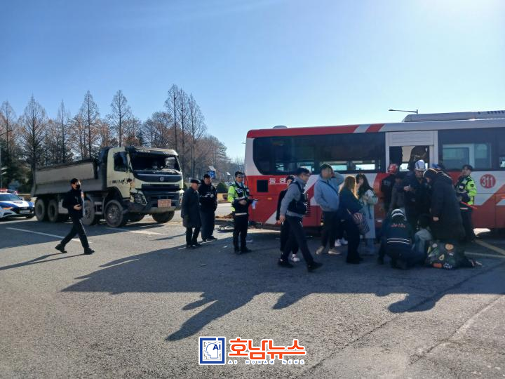 전남소방본부에 따르면 3월 19일 오전 8시 58분경, 담양군 담양읍 강쟁리 담양공고 회전교차로에서 덤프트럭과 고속버스가 추돌하는 사고가 발생했다.