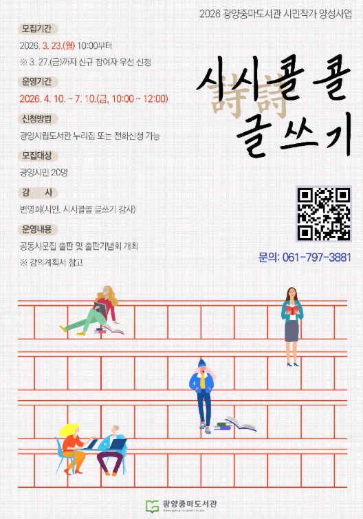 수강생 모집은 3월 23일부터 4월 9일까지 선착순으로 실시되며, 광양시립도서관 누리집 또는 전화로 신청할 수 있다. 모집 인원은 총 20명이다.