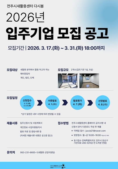 신청은 전자우편 또는 우편·방문 접수로 가능하며, 입주기업 모집과 관련한 자세한 사항은 전주시새활용센터 다시봄 누리집에서 확인하거나 전화로 문의하면 된다.