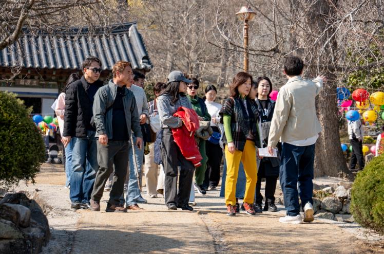 ![]() ‘일장춘몽’ 참가자들이 선암사에서 인문학 해설을 들으며 산책하고 있다 |