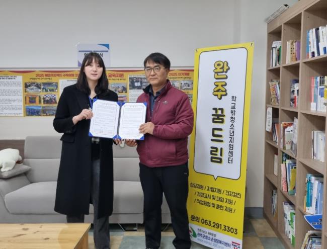 한편, 완주군학교밖청소년지원센터는 학교 밖 청소년을 대상으로 상담‧교육‧자립지원 등 다양한 맞춤형 서비스를 제공하며 청소년이 건강하게 사회에 적응할 수 있도록 지원하고 있다.