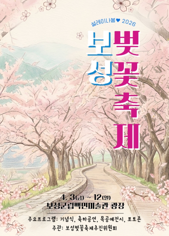 보성벚꽃축제추진위원회 조연옥 위원장은“지역민이 함께하는 제13회 보성벚꽃축제를 통해 보성의 아름다움을 알리고 싶다.”라며“다시 피는 벚꽃처럼 사랑하는 사람들과 함께 보성왕벚꽃터널에서 2026년 봄을 시작하길 바란다.”라고 말했다.