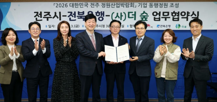 전주시와 ㈜전북은행, (사)더숲(대표 정명운)은 3일 시청 3층 소회의실에서 윤동욱 전주시장 권한대행 부시장과 김은호 전북은행 부행장, 정명운 (사)더숲 대표 등이 참석한 가운데 ‘2026 대한민국 전주정원산업박람회’ 기업동행정원 조성을 위한 업무협약을 체결했다.