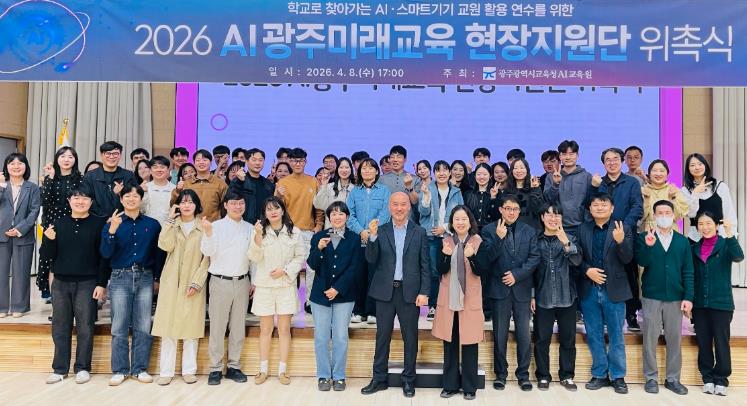 ![]() 광주AI교육원이 지난 8일 본원 대강당에서 ‘AI광주미래교육 현장지원단’을 위촉했다.(앞줄 정가운데 남성, 광주AI교육원 최규남 원장) /광주시교육청 제공 |
