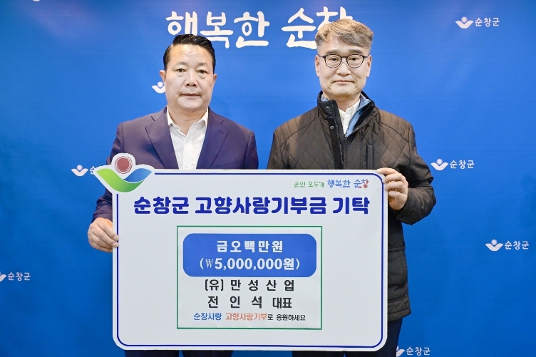 [AI 호남뉴스]순창군은 13일 (유)만성산업 전인석 대표가 고향사랑기부금 500만원을 기탁했다고 밝혔다.