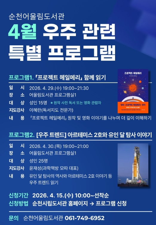 프로그램 접수는 오는 15일 오전 10시부터 순천시립도서관 누리집을 통해 선착순으로 진행된다.