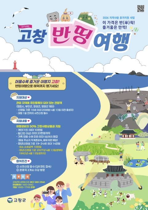 고창군은 연초부터 반띵여행 사업의 안정적 추진을 위해 체계적으로 준비해 왔다. 그결과 문화체육관광부와 한국관광공사가 주관 ‘2026 지역사랑 휴가지원 시범사업’ 공모에 선정되는 쾌거를 거뒀다.
