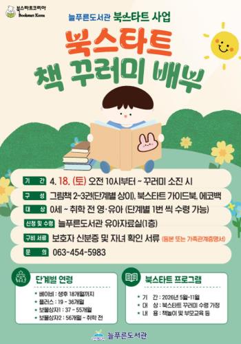 북스타트 꾸러미 신청 및 수령은 4월 18일부터 늘푸른도서관 1층 유아자료실에서 가능하며, 보호자 신분증과 자녀 확인이 가능한 등본 또는 가족관계증명서를 지참하여 현장에서 수령할 수 있다.