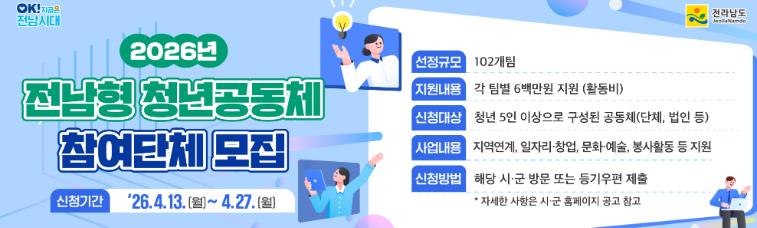 정혜정 전남도 청년희망과장은 “청년공동체의 자율적 활동을 지원하는 것을 넘어 지역사회와 연계된 실질적 성과 창출에 중점을 두고 있다”며 “참신한 아이디어와 실천 의지를 갖춘 청년공동체의 많은 관심과 참여 바란다”고 말했다.