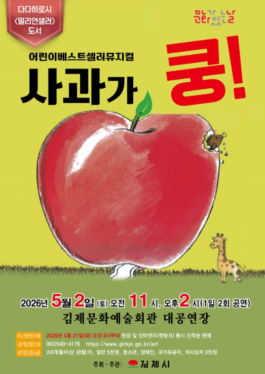 이번 공연은 숲속에 커다란 사과가 떨어지자 개미, 너구리, 사자와 같은 많은 동물들이 그곳에 찾아와 사과를 나눠 먹으며 사각사각, 아작아작, 냠냠냠 등의 의성어를 다양하게 접할 수 있고, 동물 친구들끼리 사과를 사이좋게 나눠 먹고, 비도 협심해 피하는 예쁜 동화 뮤지컬이다.
