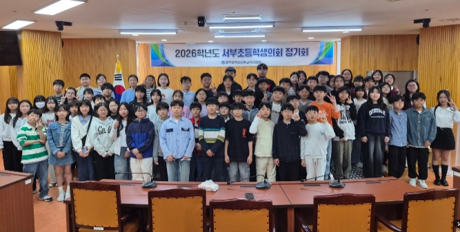 ![]() 광주서부교육지원청이 15일 광주시교육청학생독립운동기념회관 학생의회실에서 ‘2026학년도 서부초등학생의회 제1차 정기회’를 개최해 의장단을 선출했다. /광주시교육청 제공 |