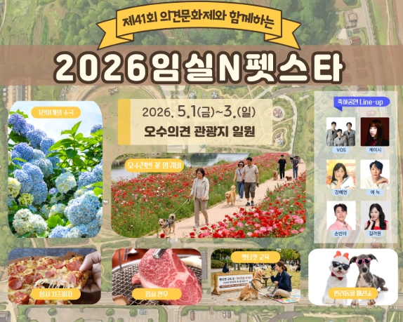 군은 오는 5월 1일부터 3일까지 임실 오수의견관광지 전역에서 제41회 의견문화제와 연계한‘2026 임실N펫스타’를 개최한다고 밝혔다.