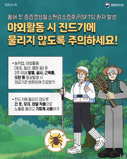 중증열성혈소판감소증후군(SFTS)은 농작업, 임산물 채취, 등산 등 야외활동 과정에서 진드기에 물려 감염되는 질환으로, 주로 봄부터 발생한다. 잠복기는 5일에서 14일이며, 38도 이상의 고열과 오심, 구토, 설사 등 소화기 증상이 나타날 수 있다. 치명률이 높고 예방 백신과 치료제가 없어 주의가 필요하다.